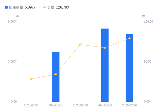 近一年(2025年2月28日至2026年2月28日),华虹公司A股股东户数从4.61万户,增加至5.09万户,增幅10.37%,区间股价上涨129.72%。
