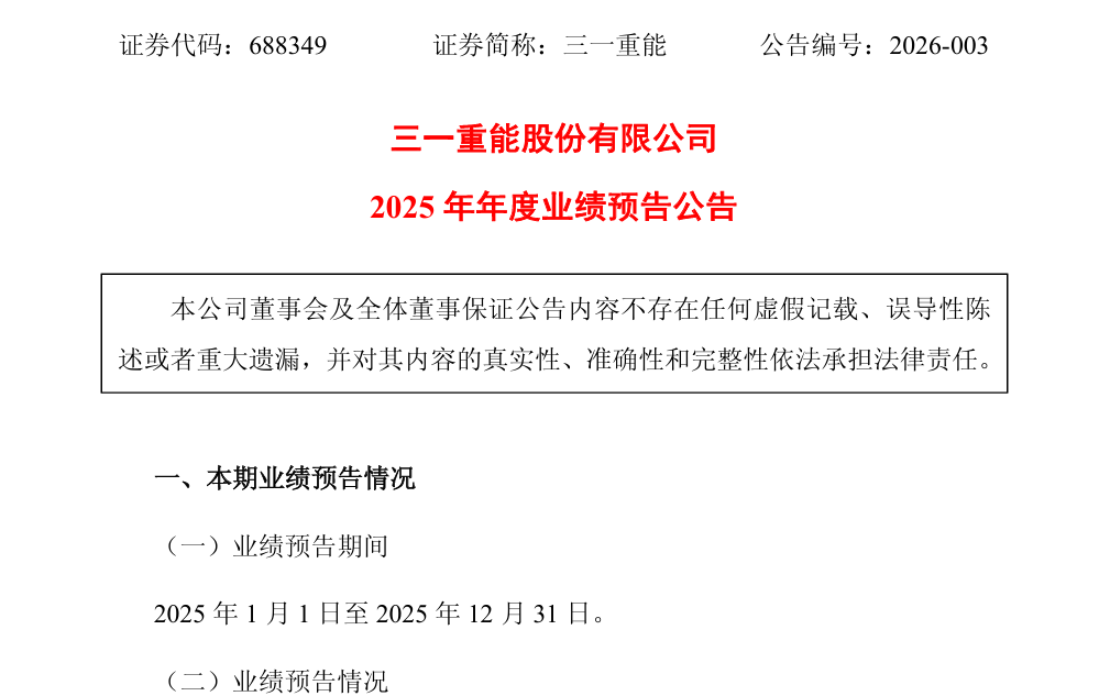 1月31日,三一重能股份有限公司(以下简称“三一重能”或“公司”)发布《2025年年度业绩预告公告》。