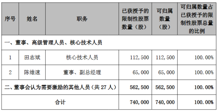 根据董事会的审议,本次可归属的限制性股票数量为74万股,符合条件的激励对象共29人,可归属对象名单及归属情况如下: