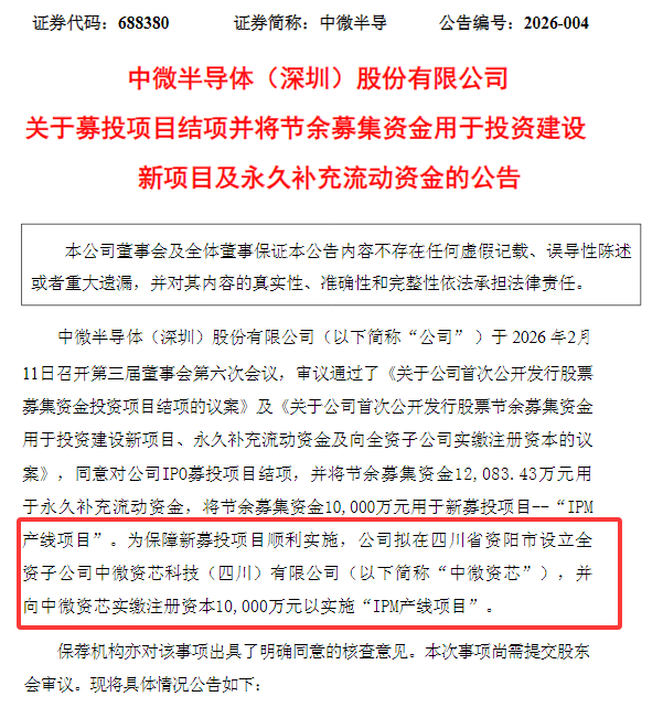 2月11日晚间,中微半导公告称,公司于当日召开第三届董事会第六次会议,审议通过了《关于公司首次公开发行股票募集资金投资项目结项的议案》及《关于公司首次公开发行股票节余募集资金用于投资建设新项目、永久补充流动资金及向全资子公司实缴注册资本的议案》,同意对公司IPO募投项目结项,并将节余募集资金12,083.43万元用于永久补充流动资金,将节余募集资金10,000万元用于新募投项目——“IPM产线项目”。为保障新募投项目顺利实施,公司拟在四川省资阳市设立全资子公司中微资芯科技(四川)有限公司,并向中微资芯实缴注册资本10,000万元以实施“IPM产线项目”。