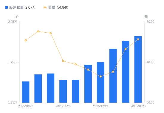 近一年(2025年2月10日至2026年1月20日),联芸科技A股股东户数从2.42万户,减低至2.07万户,降幅14.15%,区间股价上涨21.27%。