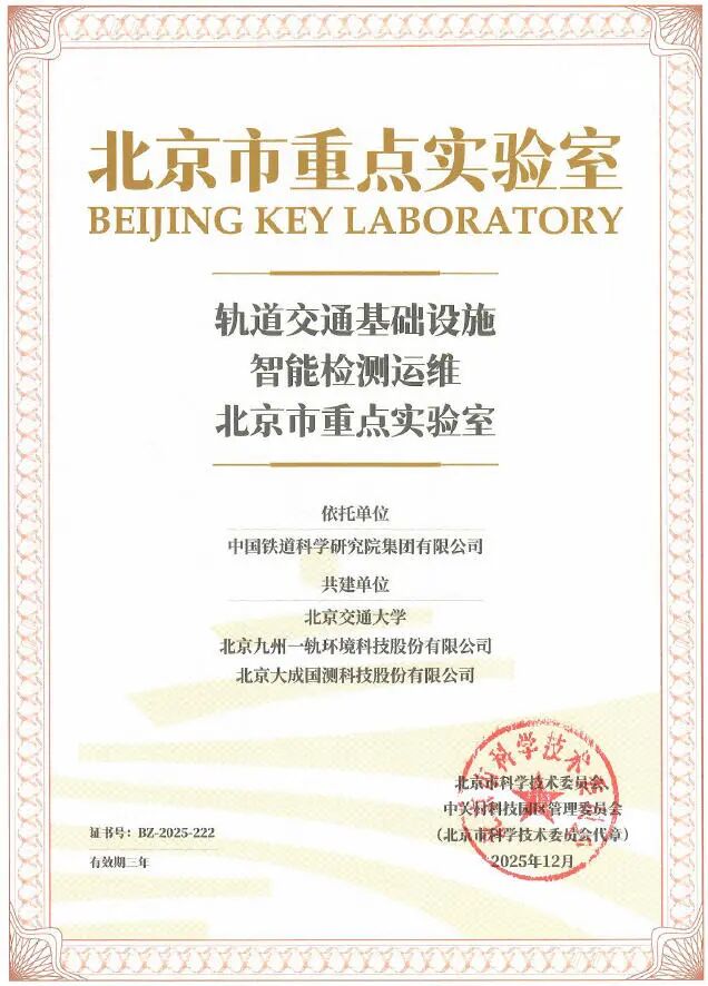 近日,由中国铁道科学研究院集团有限公司作为依托单位,我司参与共建的“轨道交通基础设施智能检测运维北京市重点实验室”正式获得北京市科学技术委员会、中关村科技园区管理委员会的批准设立。