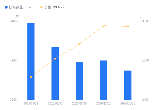 近一年(2024年12月31日至2025年12月31日),*ST天微A股股东户数从6126户,减低至4205户,降幅31.36%,区间股价上涨79.99%。
