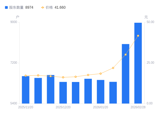 近一年(2025年3月31日至2026年2月28日),欧莱新材A股股东户数从6319户,增加至8974户,增幅42.02%,区间股价上涨134.11%。