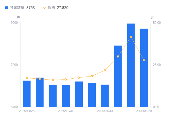 近一年(2025年3月31日至2026年3月20日),欧莱新材A股股东户数从6319户,增加至8753户,增幅38.52%,区间股价上涨56.34%。