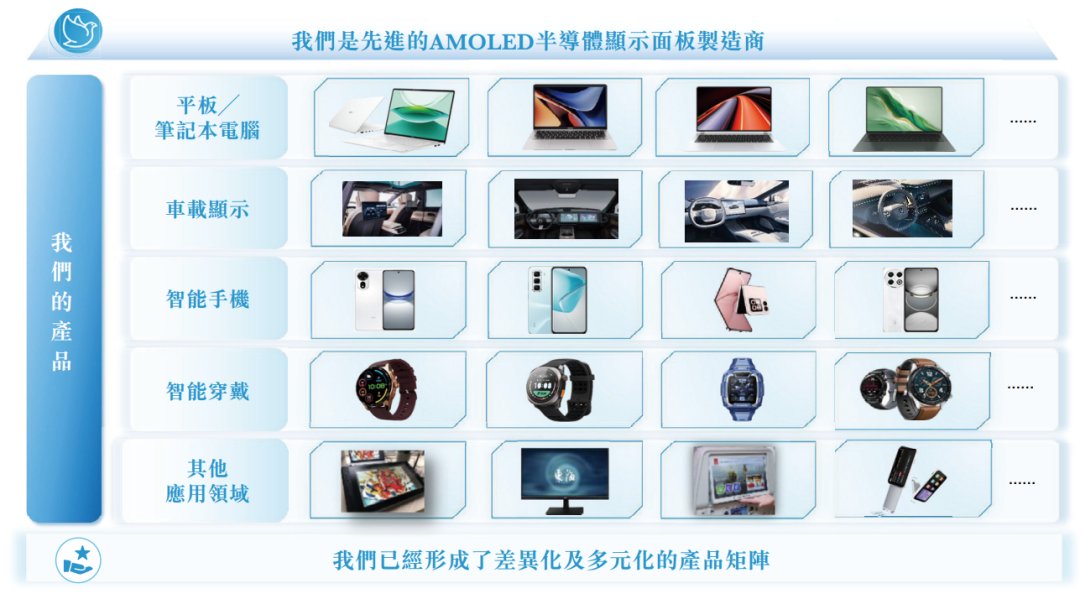 公司坚持「刚柔并济」的战略,具备生产刚性、柔性及Hybrid AMOLED显示面板的能力,能够流畅切换以根据规格生产不同产品。亦推出了可折叠及曲面显示面板等创新产品,以紧跟行业趋势及满足客户需求。