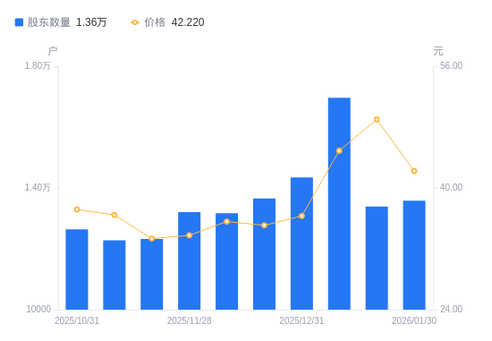 2月4日消息,数据显示,截至2026年1月30日,航天南湖A股股东总户数为1.36万户,较上期(2026年1月20日)增加190户,增幅1.42%。公司最新A股总股本为3.37亿股,其中流通A股8682.76万股,户均持有流通A股数量为6394.25股,较上期减少90.74股,降幅1.40%;户均持流通A股市值27万元,较上期减少4.79万元,降幅15.06%。