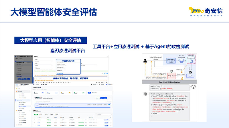 其次,产品服务方面,奇安信推出了围绕AI智能体的安全评估服务,它围绕OWASP推出的针对智能体应用的十大安全风险框架,围绕智能体目标劫持、工具滥用与利用、身份与权限滥用、智能体供应链漏洞等,对AI智能体进行全面检测,提前发现潜在漏洞,出具针对性的加固方案。目前已为金融、能源、政务等多个行业的数十家企业提供相关安全评估服务,有效推动了AI技术的安全合规应用。