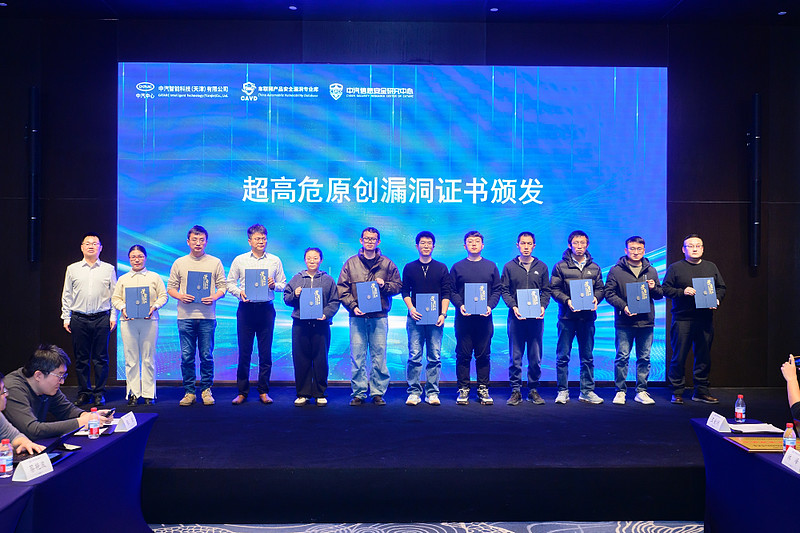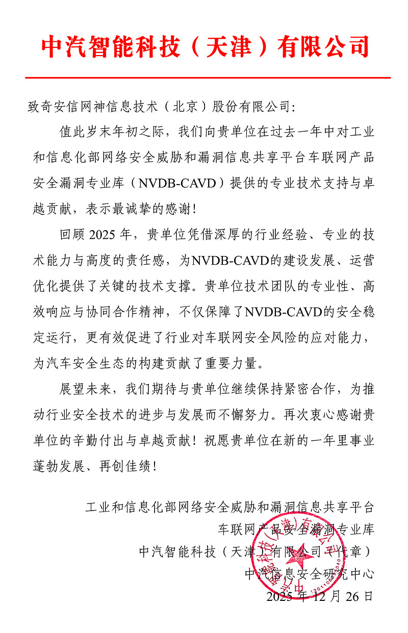 1月27日,工信部网络安全威胁和漏洞信息共享平台车联网产品安全漏洞专业库(NVDB-CAVD)2025年终总结会在京召开。奇安信作为技术支撑单位代表受邀参会并作经验分享,荣获"2025年度优秀技术支撑单位"称号,同时获得10项超高危原创漏洞证书,成为本次会议中获颁漏洞证书数量最多的单位。