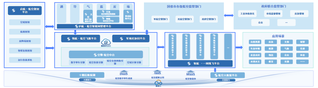 公司基于空天信息多圈层数据供给能力,以星图超算云网(IaaS)、低空数字孪生底座(DaaS)、低空智能体(MaaS)等设施为基础,依托G-DGGS与GeoSOT空域网格剖分技术,整合通信、导航、监视、气象、反制、起降场等低空基础设施运行数据,打造“低空一朵云”,提供低空数据全要素支撑、低空全息网格计算、低空规划和运行全流程仿真和实时管控,为国省市各级低空监管部门、政府联合监管部门、各类低空飞行服务用户,提供低空空中交通管理、政府联合监管、安全协同监管和数据信息服务等全方位解决方案,为低空经济高质量发展保驾护航。