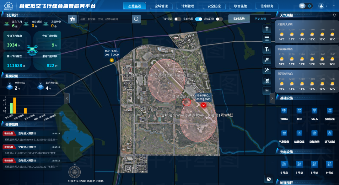 支撑政府主导的运行管理能力:合肥低空飞服平台是支撑构建政府主责的低空运行管理与服务配套支撑能力的重要保障,可实现低空飞行活动“可视、可控,合法、合规,安全、有序、高效”管理,为政府统筹低空资源、协调多方主体提供关键支撑。