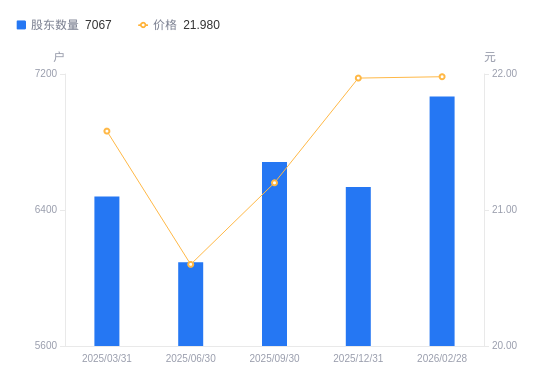 3月27日消息,数据显示,截至2025年12月31日,铁科轨道A股股东总户数为6536户,较上期(2025年9月30日)减少146户,降幅2.18%。公司最新A股总股本为2.11亿股,其中流通A股2.11亿股,户均持有流通A股数量为3.22万股,较上期增加704.26股,增幅2.23%;户均持流通A股市值70.81万元,较上期增加3.97万元,增幅5.95%。