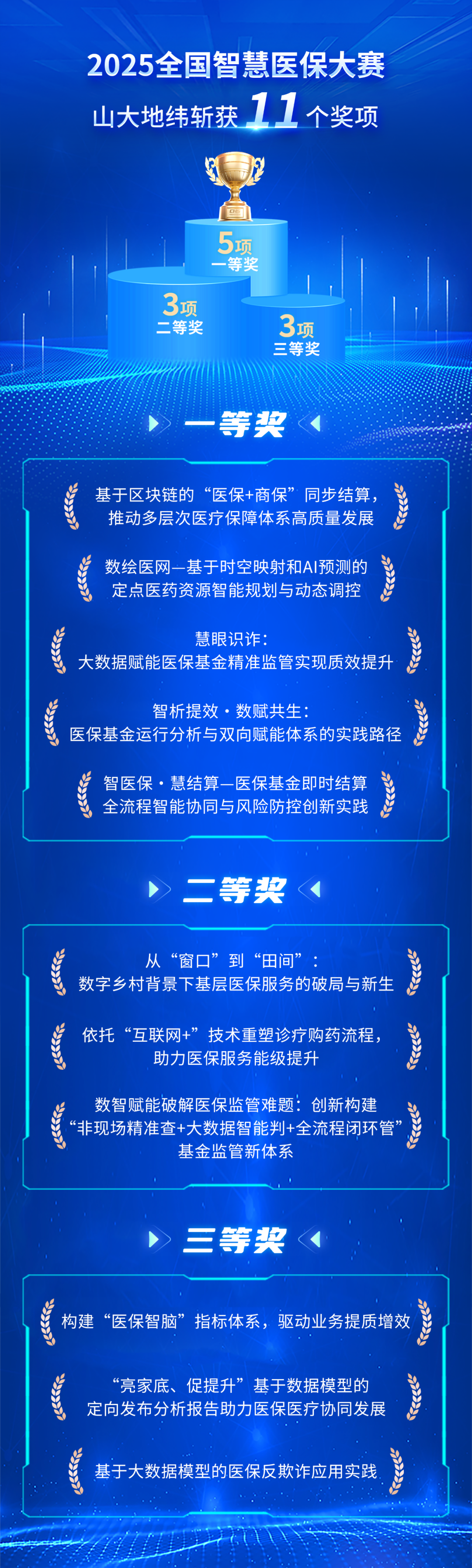 近日,由国家医疗保障局与上海市人民政府联合主办的2025全国智慧医保大赛获奖名单正式揭晓。山大地纬携手多省市医保部门,凭借前瞻性的技术和创新成果,在全国800余支参赛队伍中脱颖而出,一举斩获一等奖5项、二等奖3项、三等奖3项,共11个奖项,彰显了公司在医保信息化领域的领先地位和卓越实力。