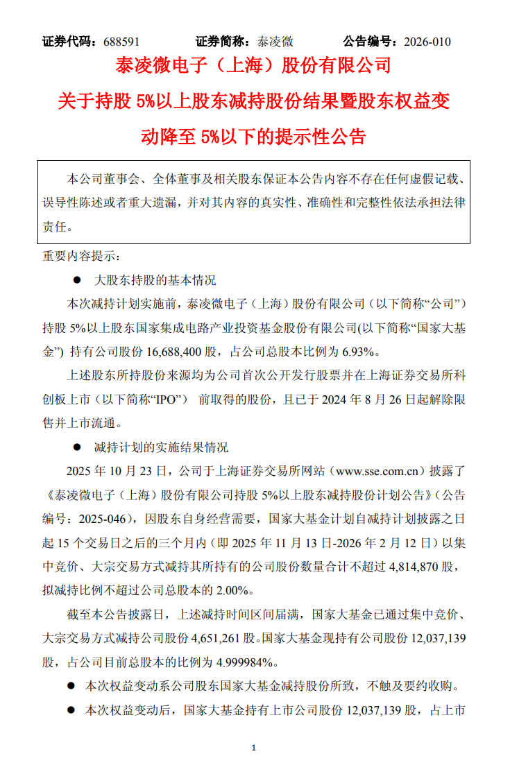 2月12日,泰凌微(688591.SH)发布公告称,公司持股5%以上股东国家集成电路产业投资基金股份有限公司已完成减持计划。