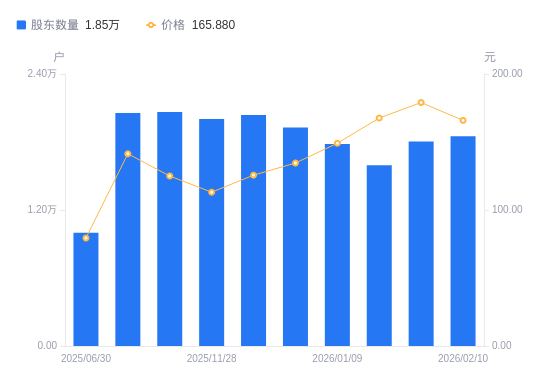 2月12日消息,数据显示,截至2026年1月30日,芯碁微装A股股东总户数为1.8万户,较上期(2026年1月20日)增加2100户,增幅13.17%。公司最新A股总股本为1.32亿股,其中流通A股1.32亿股,户均持有流通A股数量为7301.49股,较上期减少961.75股,降幅11.64%;户均持流通A股市值130.71万元,较上期减少7.8万元,降幅5.63%。