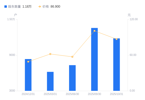 近一年(2024年12月31日至2025年10月31日),京仪装备A股股东户数从8337户,增加至1.18万户,增幅41.74%,区间股价上涨73.33%。