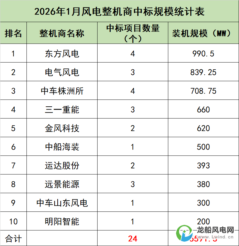 东方风电排名第一,共中标4个风电项目,中标规模累计990.5MW;