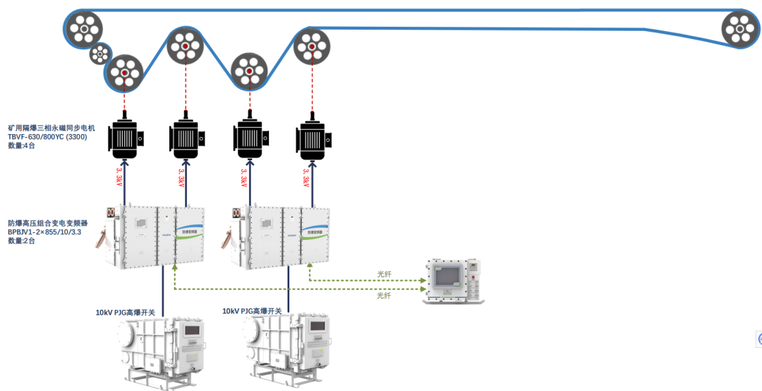该煤矿核定年产能为800~1000万吨。在其胶带机大巷的机头位置,配置了4台3300V 630kW 永磁同步电机,采用并排不同轴驱动方式。驱动系统配置了新风光最新研制的防爆高压组合变频器(BPBJV1-2×855/10/3.3),采用10kV电压直接输入,无需前级移变,输出电压2×3.3kV,同时驱动两台电机。目前系统运行稳定,并采用“三用一备”的高可靠性运行模式,在保障连续生产的同时,也大幅提升了系统冗余与维护便利性。