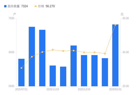 近一年(2025年2月7日至2026年1月31日),新风光A股股东户数从7607户,减低至7324户,降幅3.72%,区间股价上涨156.13%。