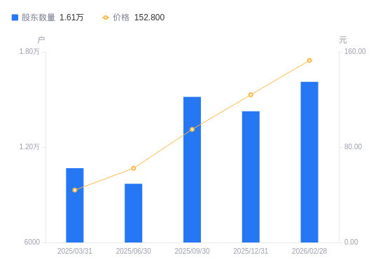 近一年(2025年3月31日至2026年2月28日),鼎通科技A股股东户数从1.07万户,增加至1.61万户,增幅50.95%,区间股价上涨253.21%。