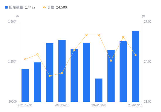 近一年(2025年3月31日至2026年3月31日),福立旺A股股东户数从6657户,增加至1.44万户,增幅116.87%,区间股价下跌7.51%。