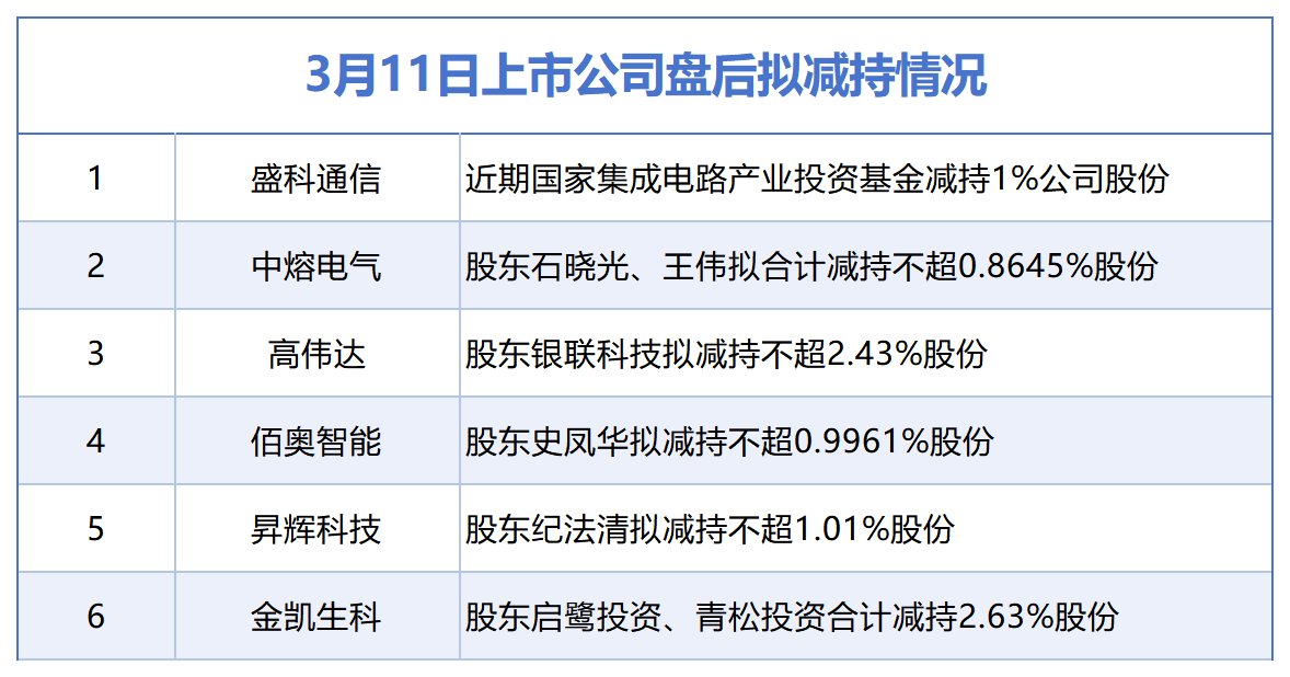 据统计,3月11日,盘后盛科通信、中熔电气、高伟达、佰奥智能、昇辉科技、金凯生科7股披露拟减持情况,当日暂无A股公司披露增持情况。