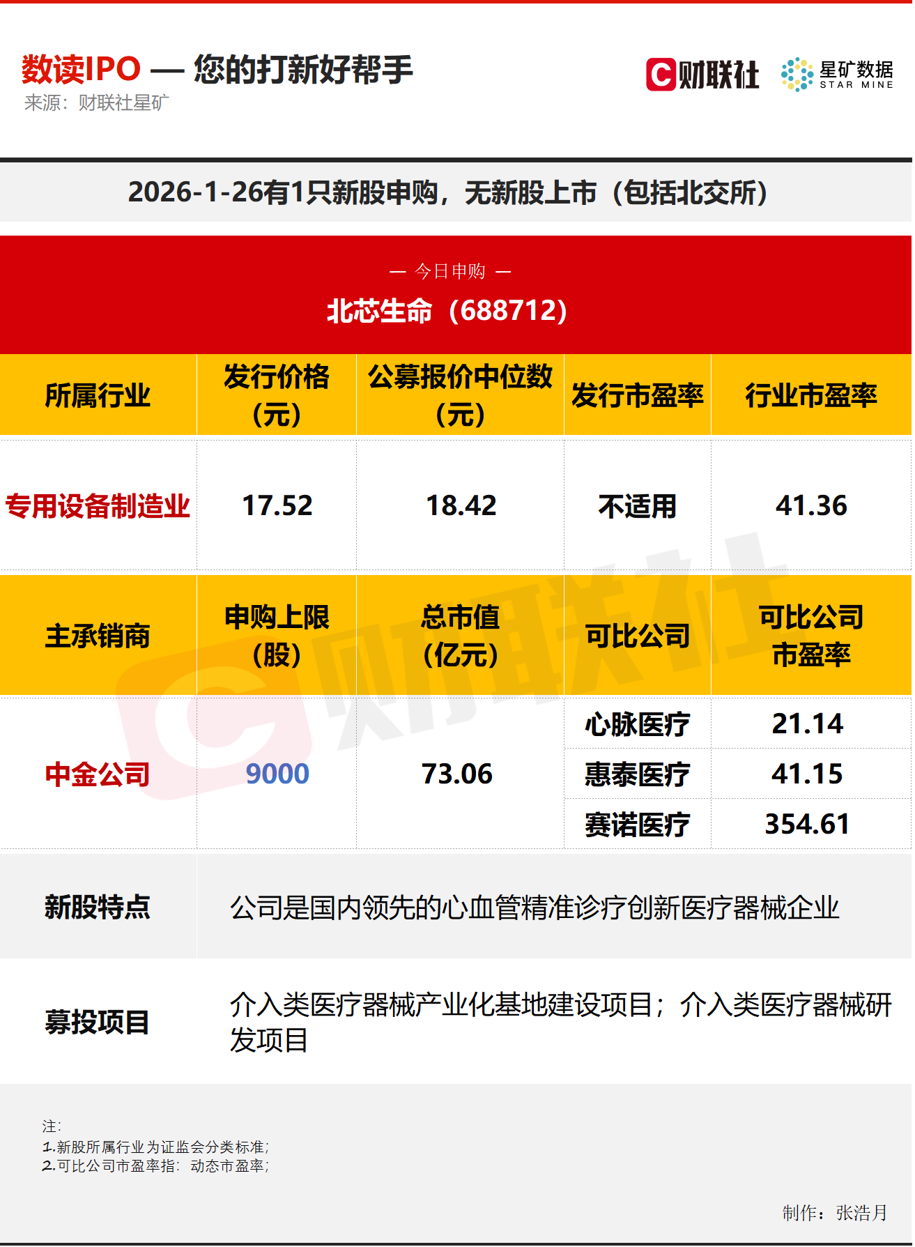 财联社1月26日讯,今日有1只新股申购,为科创板的北芯生命;无新股上市。
