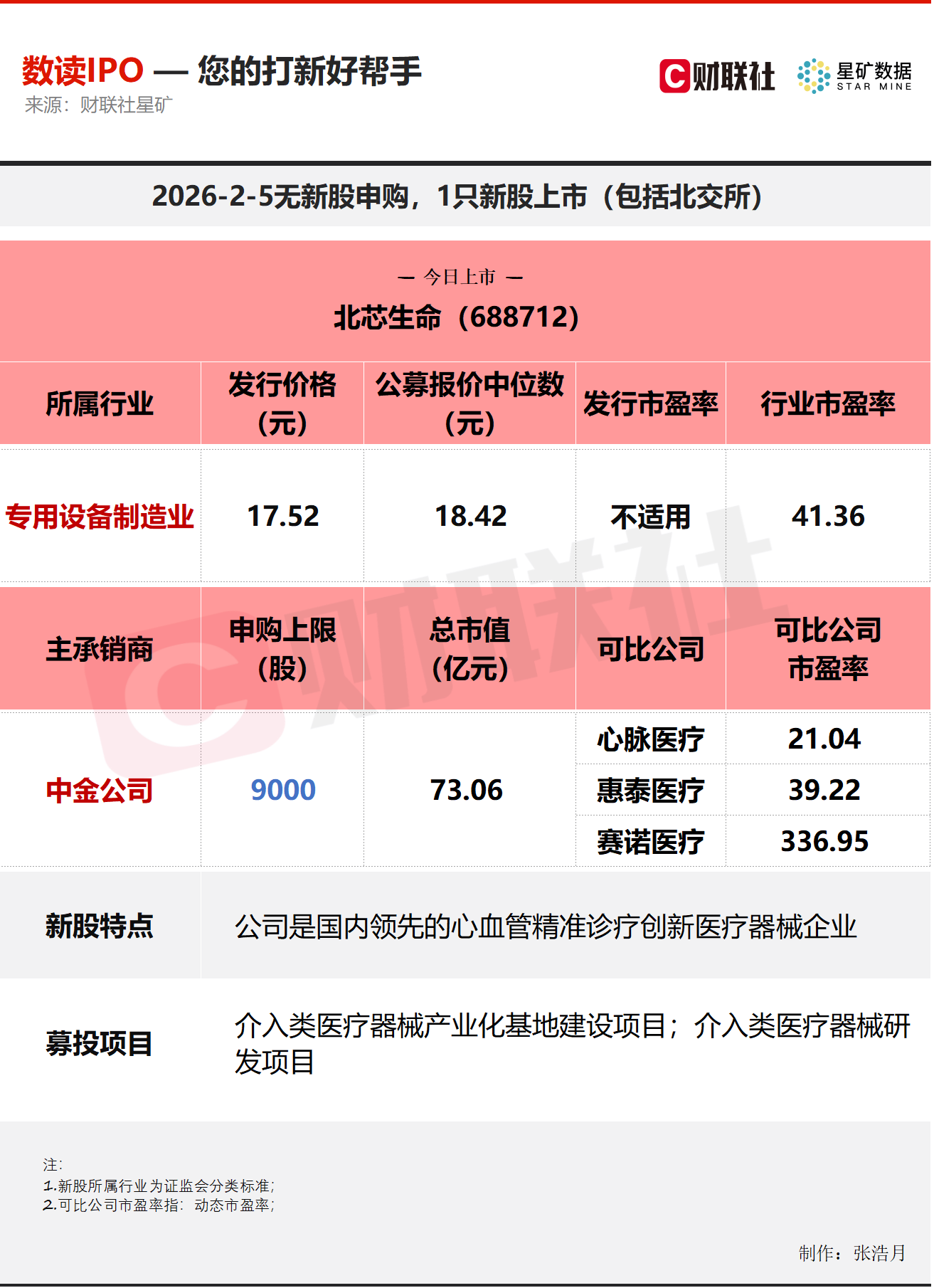 财联社2月5日讯,今日无新股申购;有1只新股上市,为科创板的北芯生命。