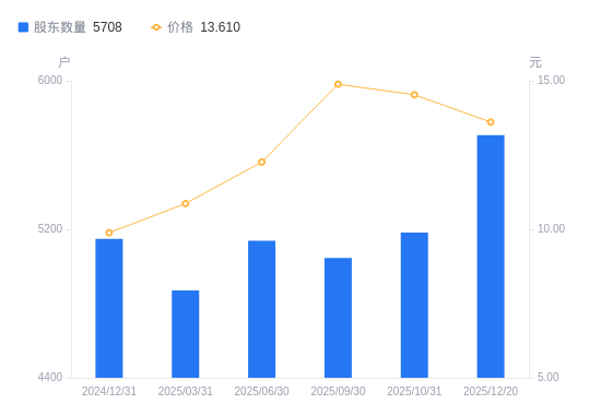 近一年(2024年12月31日至2025年12月20日),唯赛勃A股股东户数从5148户,增加至5708户,增幅10.88%,区间股价上涨33.50%。