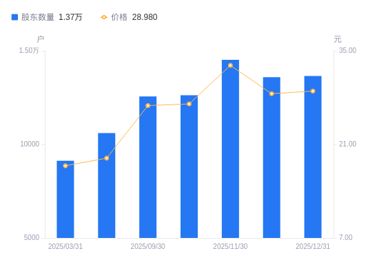 1月22日消息,数据显示,截至2025年12月31日,壹石通A股股东总户数为1.37万户,较上期(2025年12月20日)增加60户,增幅0.44%。公司最新A股总股本为2亿股,其中流通A股2亿股,户均持有流通A股数量为1.46万股,较上期减少64.57股,降幅0.44%;户均持流通A股市值42.4万元,较上期增加3859.75元,增幅0.92%。