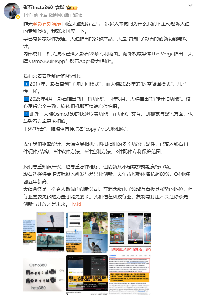 24日,影石中国区负责人袁跃再次回应,称此前多家媒体指出,大疆推出的多款产品,大量“复制”了影石的创新功能与设计。内部统计,相关技术已落入影石28项专利保护范围。