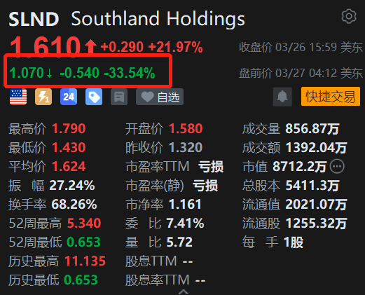 格隆汇3月27日|北美规模最大的基建承包商之一Southland(SLND.US)盘前大幅下跌33.5%。消息上,Southland Holdings于3月25日发布了2025年第四季度及全年财报。2025年Q4营收1.04亿美元,同比-61.1%,较2.11亿美元大幅不及预期;净亏损-2.16亿美元,去年同期-420万美元,预期-0.21美元/股亏损扩大超50倍。这是一份被一次性诉讼损失严重拖累的成绩单——单季度净亏损高达2.16亿美元,远超市场预期,但公司仍手握20亿美元订单,并已启动战略重组计划。
