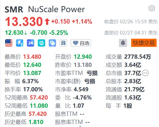 格隆汇2月27日|美股核电股NuScale Power(SMR.US)盘前下跌超5%,报12.63美元。消息面上,公司公布业绩显示,2025财年年度收入为3147万美元,下降14.9%,主要由于许可协议收入减少;净亏损6.645亿美元。值得注意的是,2025年第四季,NuScale的营收急剧萎缩至仅180万美元,相较于Q3的820万美元出现断崖式下跌。