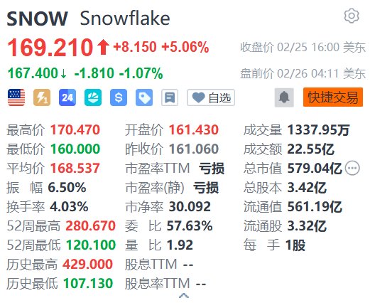 云数据分析平台提供商Snowflake(SNOW.US)盘前跌1.07%,报167.4美元。消息面上,尽管公司对2027财年产品营收的预测超出华尔街预期,且人工智能(AI)需求持续推动业务增长,市场对传统软件企业能否在AI时代保持增长动力的担忧情绪依然笼罩。Snowflake股价今年以来已累跌约23%,反映出华尔街对软件行业在AI时代前景的普遍担忧。“投资者目前对所有软件公司都持怀疑态度,”D.A. Davidson分析师Gil Luria表示,“但随着Snowflake在今年余下时间持续加速增长,我们相信投资者终将意识到该公司正从AI增长中显著受益。”(格隆汇)