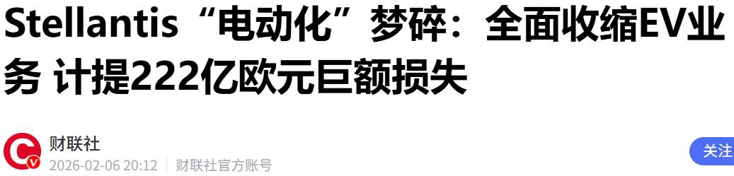 由于该消息伴随着Stellantis历史性的财报“爆雷”,Stellantis股价在2月6日当天遭遇重创,美股收盘暴跌近24%。行业分析人士指出,Stellantis的退出标志着传统汽车巨头在电动化激进扩张期的终结。面对需求降温和盈利挑战,“重资产运营”正被“弹性供应链”所取代。继福特、通用推迟电池投资后,Stellantis此举无疑再次向全球汽车业释放了冷峻的信号。