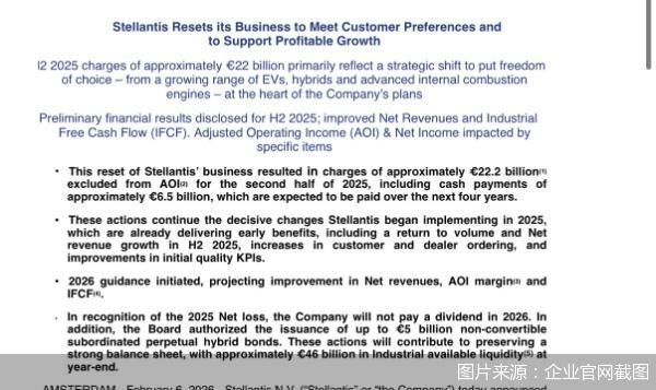 消息面上,2月6日,Stellantis宣布,业务重整导致公司在2025年下半年计提约222亿欧元的转型费用,此次减记包括约65亿欧元的现金支付,主要用于补偿供应商。Stellantis预计2025年下半年净亏损将高达210亿欧元,全年营业利润率仅为低个位数,鉴于2025年的亏损,公司决定暂停2026年的股息发放。