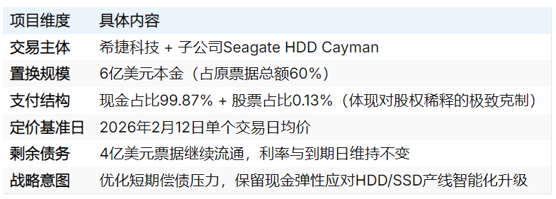 完成时间:2026年2月19日(原计划2月17日左右,依惯例微调)置换标的:Seagate HDD Cayman发行的3.50%可交换高级票据(2028年到期)对价构成:现金5.992亿美元 + 希捷普通股595万股(按2月12日单日均价核定)后续状态:置换票据已注销,剩余4亿美元票据条款不变合规路径:依《1933年证券法》第4(a)(2)条豁免注册,属非公开发行