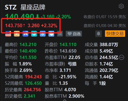 星座品牌(STZ.US)美股盘前涨2.3%报。消息上,星座品牌报告每股26财年第三季度收益为3.06美元,超过了分析师普遍预期的2.64美元;季度收入达到22.2亿美元,同样超出分析师普遍预期的21.6亿美元。星座品牌重申了其2026财年调整后每股收益指导为11.30至11.60美元,而分析师预计为11.49美元。