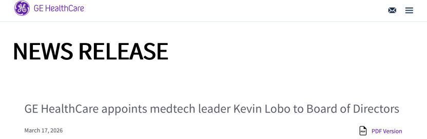 Kevin Lobo表示:“GE医疗通过先进的技术、创新的药物诊断手段以及广泛的全球影响力,在塑造医疗保健的未来方面发挥着至关重要的作用。我期待能够加入其董事会,并与管理团队合作,共同执行其战略,以实现更精准的患者护理、推动增长并创造长期价值。”