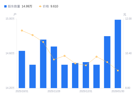 近一年(2025年2月10日至2026年1月30日),中国宝安A股股东户数从16.28万户,减低至14.99万户,降幅7.91%,区间股价上涨11.87%。