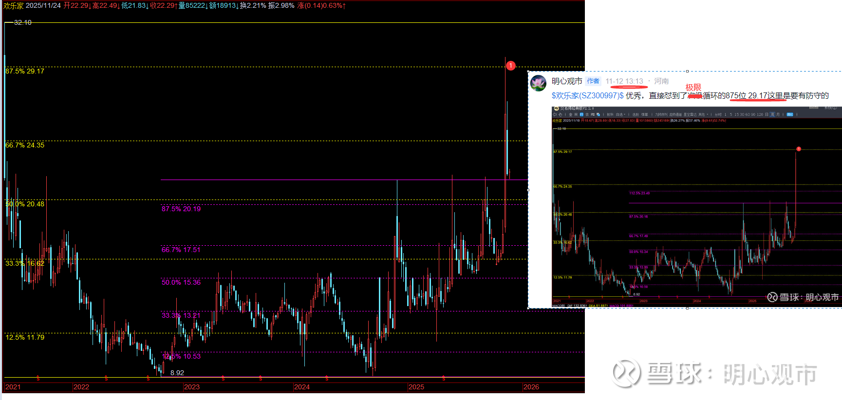 欢乐家,当前红色波段生命线线对应14.4,白色短期多空线对应14.2,叠加百分比4分之一位14.15,可得:14.4-14.15是当前重要支撑位,该价格区上,趋势看多,上方先看短压15.7,突破则顺势看高16.8;暂看16.8,后续能突破,波段内趋势进一步转强后,再看新空间。风控13.9。