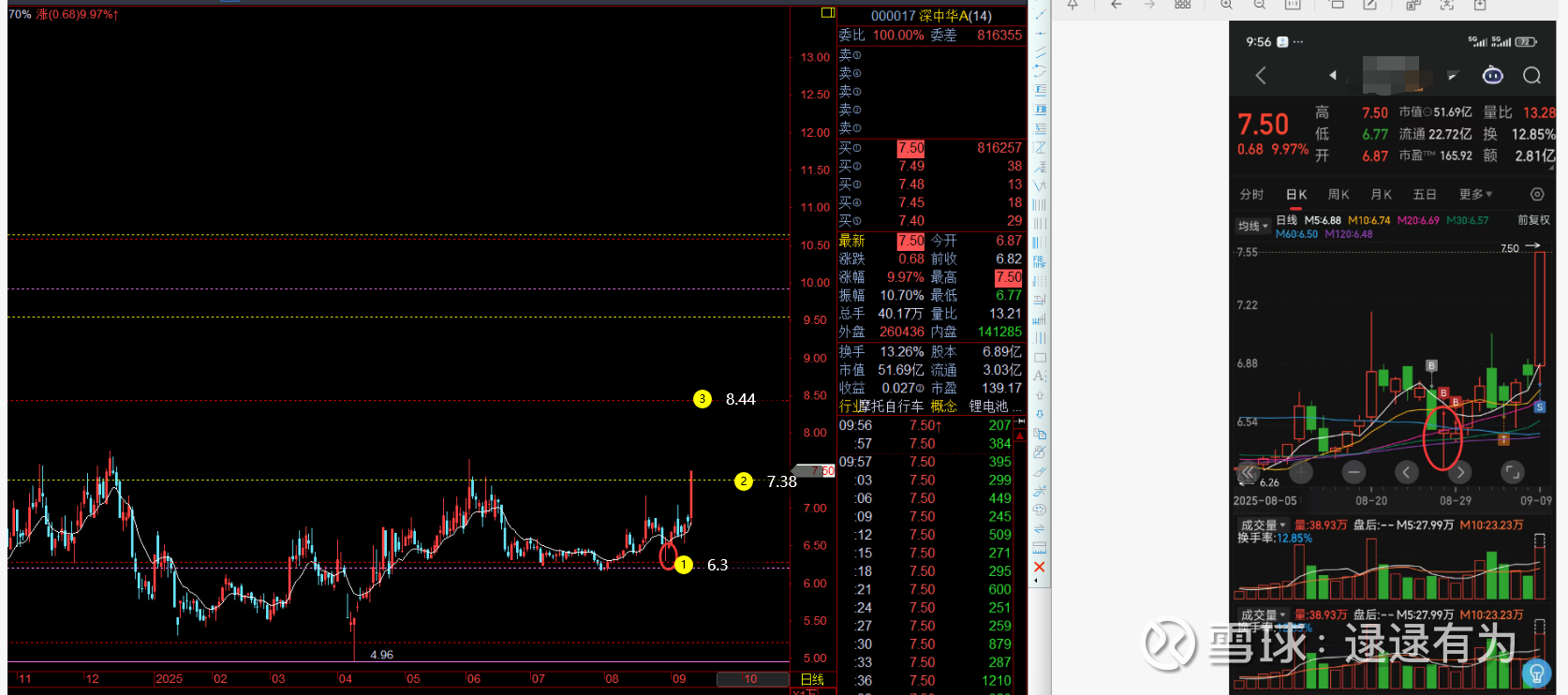 : 梳理下技术走法,6.3支撑,回踩后,加速,7.38压力直接突破,价格涨停。空间支撑对应在7.38,压力8.44附近。
