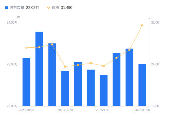 1月23日消息,数据显示,截至2026年1月9日,深科技A股股东总户数为22.76万户,较上期(2025年12月31日)增加2001户,增幅0.89%。公司最新A股总股本为15.72亿股,其中流通A股15.71亿股,户均持有流通A股数量为6905.53股,较上期减少61.26股,降幅0.88%;户均持流通A股市值18.5万元,较上期增加8878.68元,增幅5.04%。