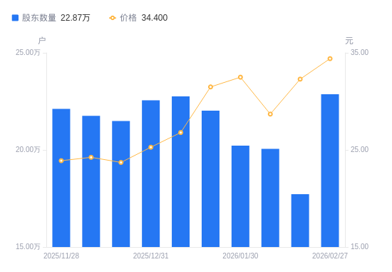 近一年(2025年2月28日至2026年2月27日),深科技A股股东户数从19.55万户,增加至22.87万户,增幅16.97%,区间股价上涨63.34%。