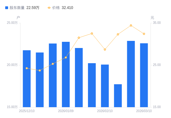 3月13日消息,数据显示,截至2026年3月10日,深科技A股股东总户数为22.59万户,较上期(2026年2月27日)减少2833户,降幅1.24%。公司最新A股总股本为15.72亿股,其中流通A股15.71亿股,户均持有流通A股数量为6957.51股,较上期增加86.19股,增幅1.25%;户均持流通A股市值22.55万元,较上期减少1.09万元,降幅4.60%。