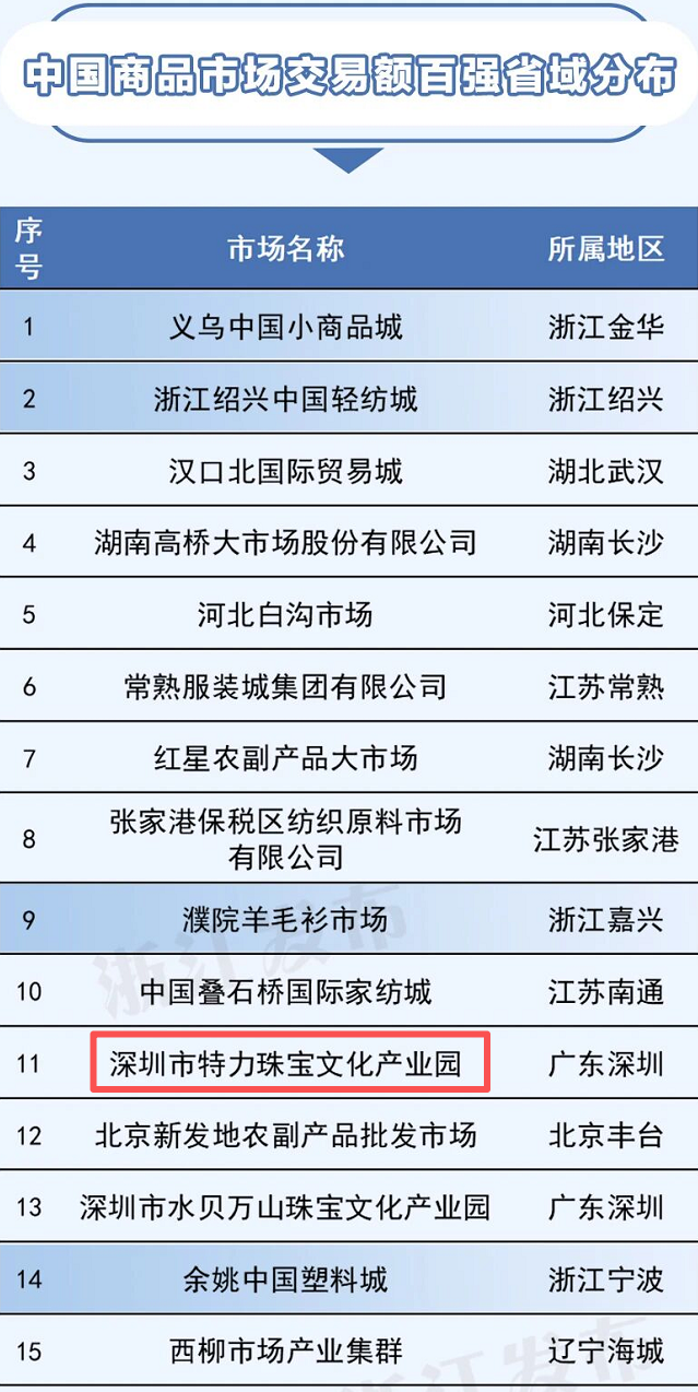 在论坛上发布的《中国商品市场交易额百强》榜单上,特力珠宝文化产业园入围《中国商品市场综合百强》榜单,从上一届的第62名跃升至第11名,排名提升了51位,成为深圳入围市场中排名最高的代表。