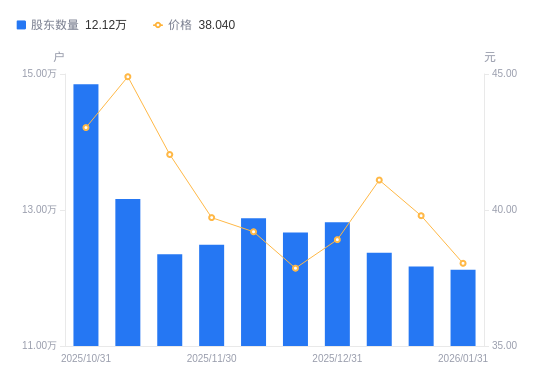 近一年(2025年2月28日至2026年1月31日),神州数码A股股东户数从14.1万户,减低至12.12万户,降幅14.04%,区间股价下跌21.56%。