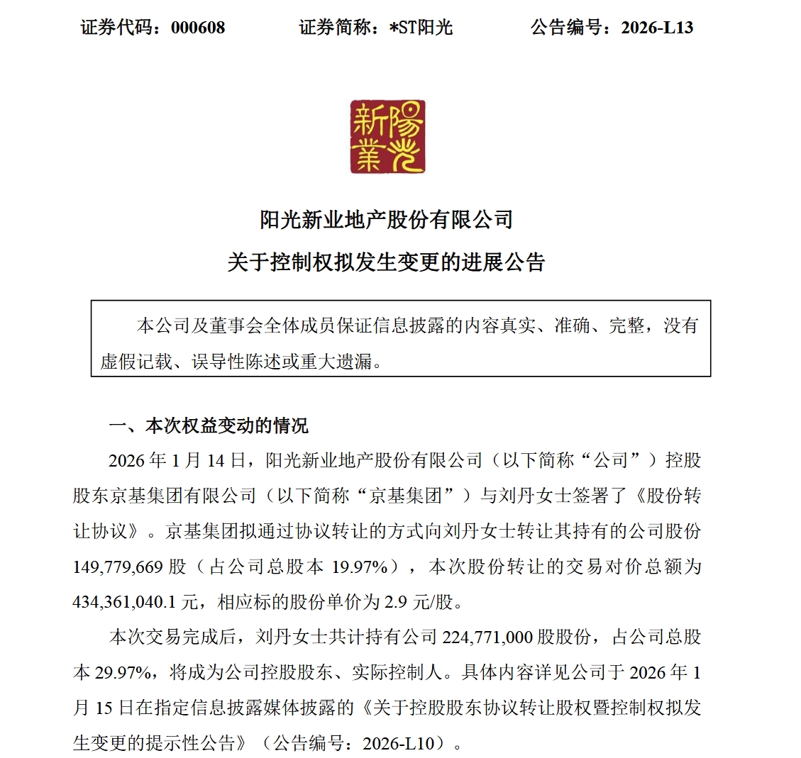 中房网讯(苏晓/文)1月27日,ST阳光(600220)发布控制权拟变更进展公告,宣告深圳地产巨头京基集团对其近六年的掌控正式落幕,交易完成后京基集团将清仓退出ST阳光,其在A股控股的上市公司仅剩京基智农(000048)。