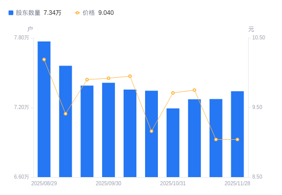 近一年(2024年11月29日至2025年11月28日),深天马AA股股东户数从8.19万户,减低至7.34万户,降幅10.40%,区间股价上涨3.55%。