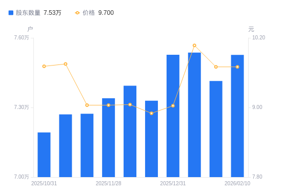 近一年(2025年2月10日至2026年2月10日),深天马AA股股东户数从7.23万户,增加至7.53万户,增幅4.12%,区间股价上涨7.54%。
